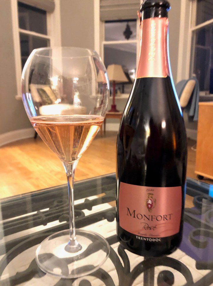 The grapes in th Monfort Rosé are grown on hillsides slopes near the towns of Trento and Pergine, at elevation of 1300-1500 feet. Grapes love high hillsides, because they get lots of sun and excellent drainage. It spent 24 months on its lees, hence the nice toasty toasty note. (I am unsure of availability in the U.S. as I received this sample, but if you ask your wine shop, they might be able to find it for you!)