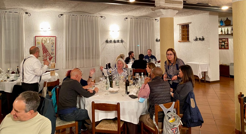 Where there is excellent food – and winemakers at every table – there is going to be a memorable night, and this was no exception. From the bresaola (dried, cured beef) to risotto to a pasta course and then local beef on a bed of polenta, this was an extravaganza of local food and wine and winemakers that no one will forget!